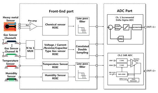 Multi - channel (8-channel) multi environment sensor ROIC and sensor are designed / made as an integral part, operating in dual mode (low power mode and high-performance mode) depending on sensor sensitivity.